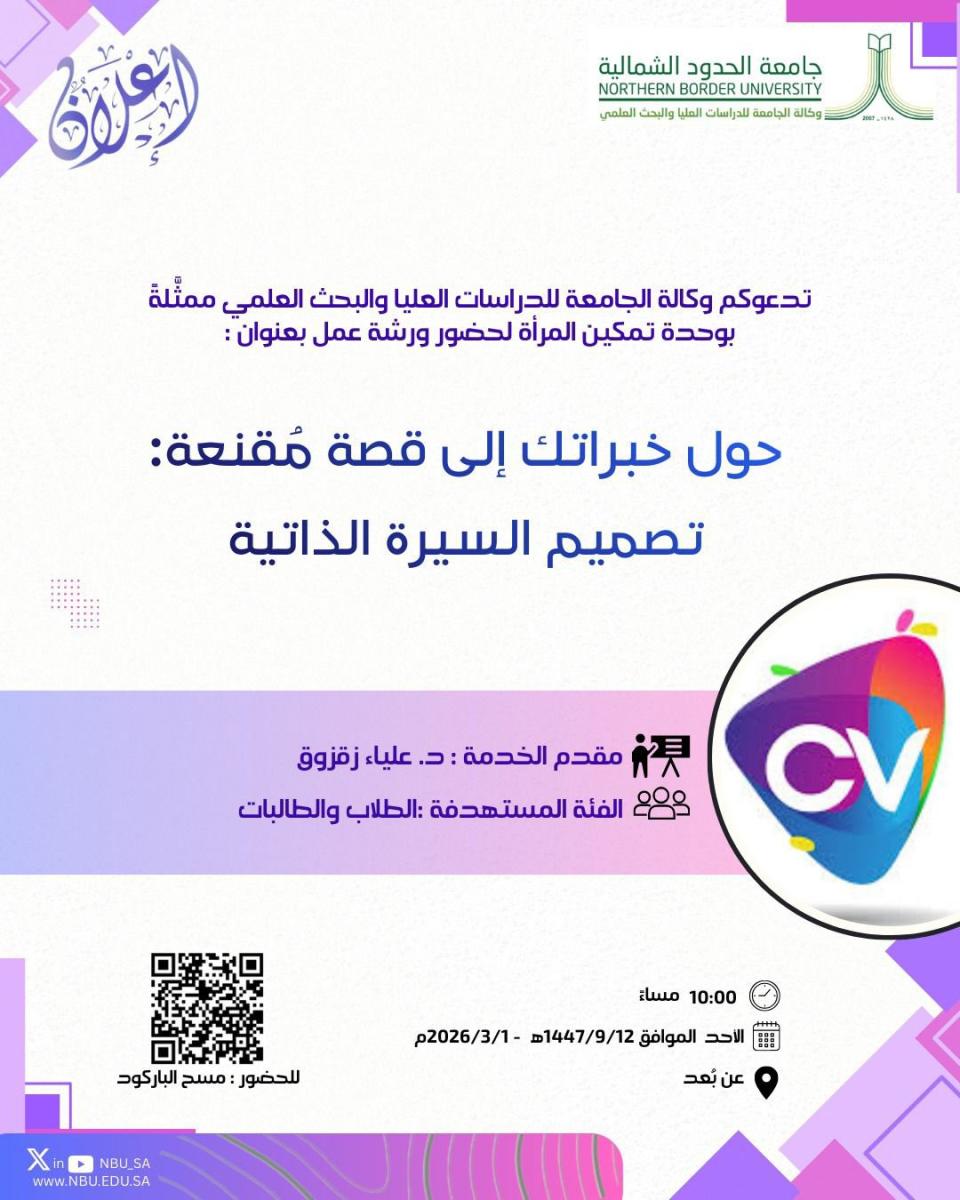 تدعوكم وكالة الجامعة للدراسات العليا والبحث العلمي متمثلة بوحدة تمكين المرأة لحضور ورشة عمل عن بعد بعنوان : (حوّل خبراتك الى قصة مقنعة: تصميم السيرة الذاتية) تقديم: د. علياء زقزوق الفئة المستهدفة: طلاب وطالبات الجامعة.