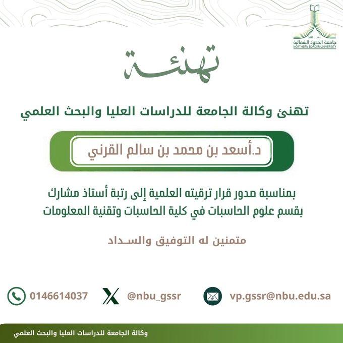تهنئ وكالة الجامعة للدراسات العليا والبحث العلمي د. أسعد بن محمد بن سالم القرني بمناسبة صدور قرار ترقيته العلمية إلى رتبة أستاذ مشارك بقسم علوم الحاسبات في كلية الحاسبات وتقنية المعلومات، متمنين له التوفيق والسداد.