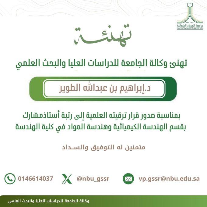تهنئ وكالة الجامعة للدراسات العليا والبحث العلمي د. إبراهيم بن عبدالله الطوير بمناسبة صدور قرار ترقيته العلمية إلى رتبة أستاذ مشارك بقسم الهندسة الكيميائية وهندسة المواد في كلية الهندسة، متمنين له التوفيق والسداد.